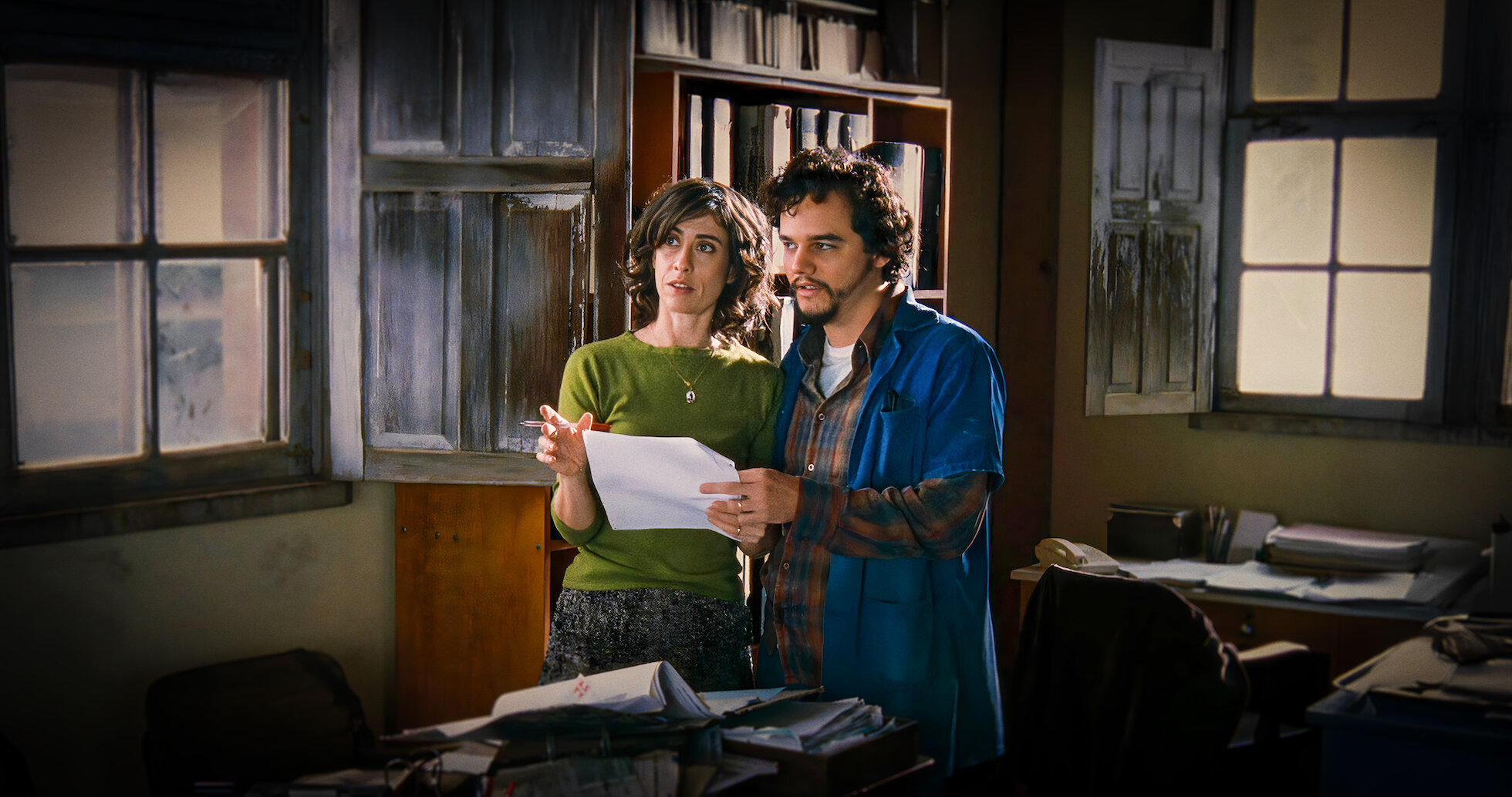 Cena do filme Saneamento Básico, na qual dois personagens (uma mulher e um homem) estão em um escritório, segurando um papel nas mãos