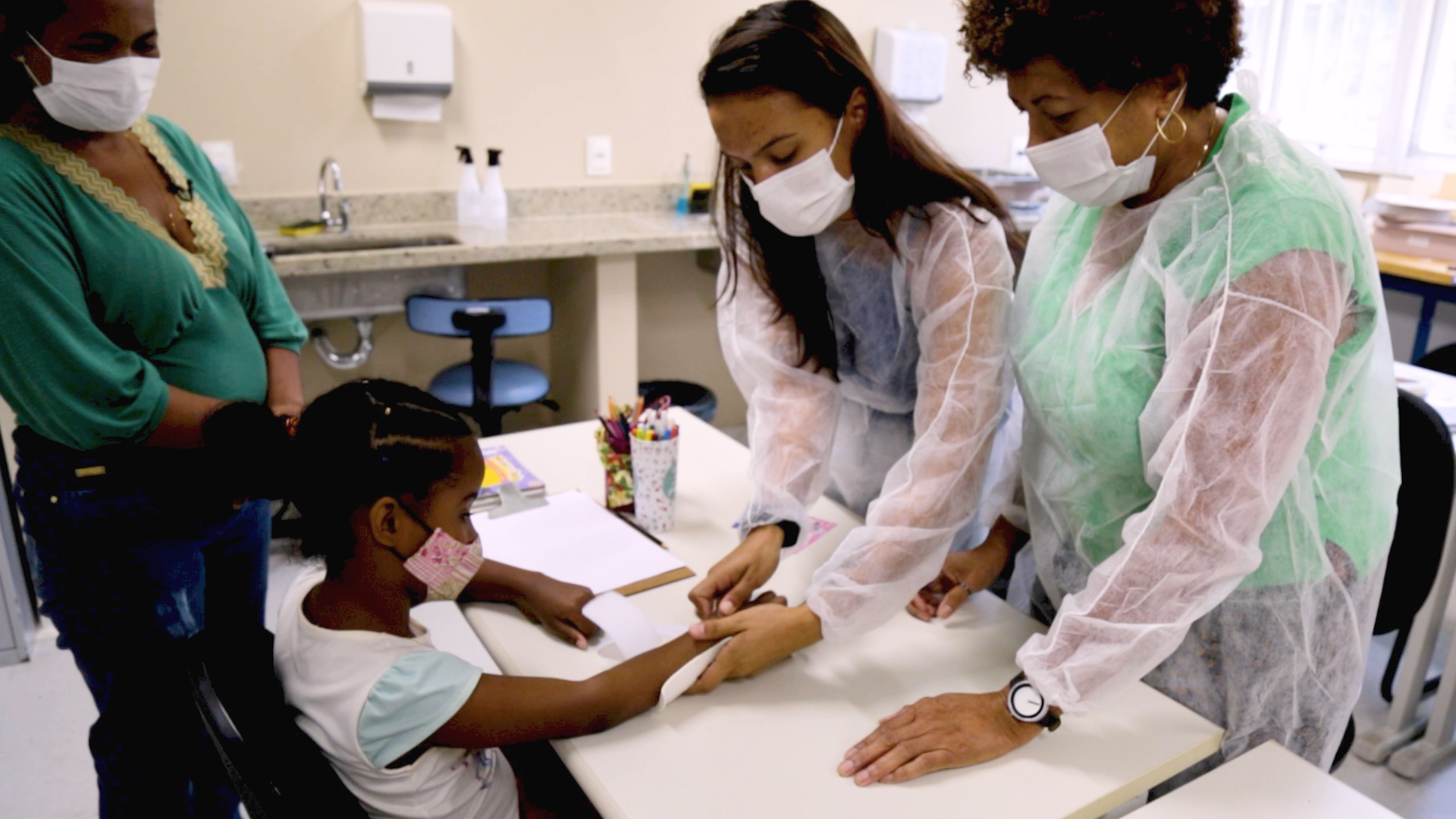 Foto de uma menina experimentando uma prótese na mão com o auxílio de duas profissionais de saúde