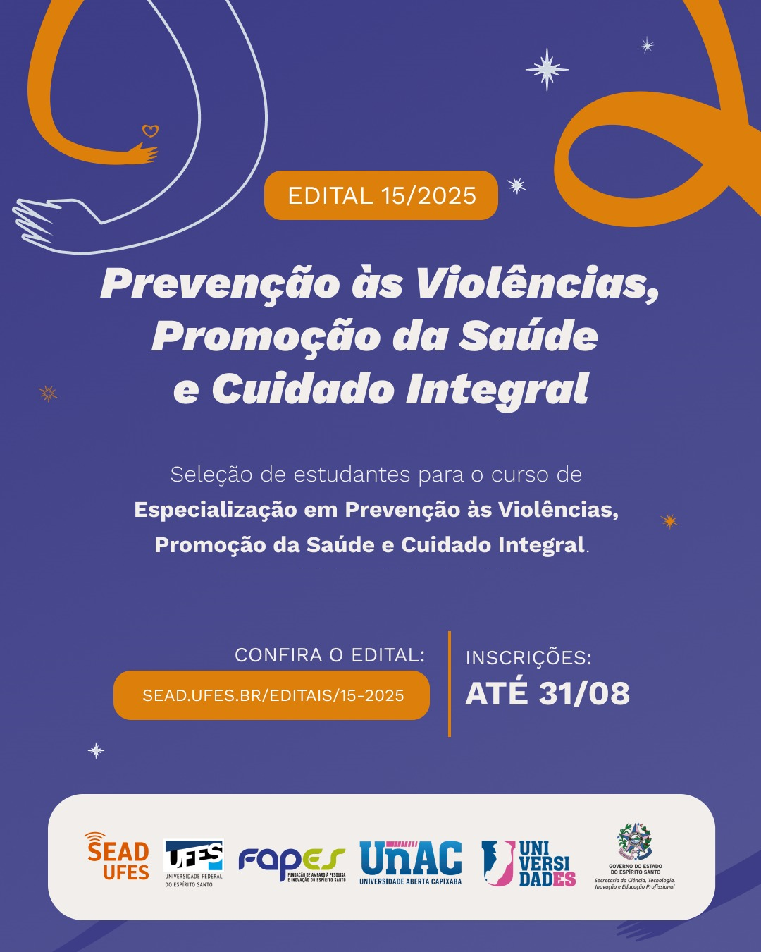 Estão abertas até 31 de agosto as inscrições para o curso de Especialização em Prevenção às Violências, Promoção da Saúde e Cuidado Integral, oferecido pela Superintendência de Educação a Distância (Sead). O público-alvo são profissionais com graduação nas áreas da Saúde, Assistência Social, Educação, Justiça, Segurança Pública e Humanas, que deverão se inscrever por meio de formulário on-line, disponibilizado na Página de Acompanhamento da Seleção, onde estão publicados o edital completo e os formulários pertinentes.