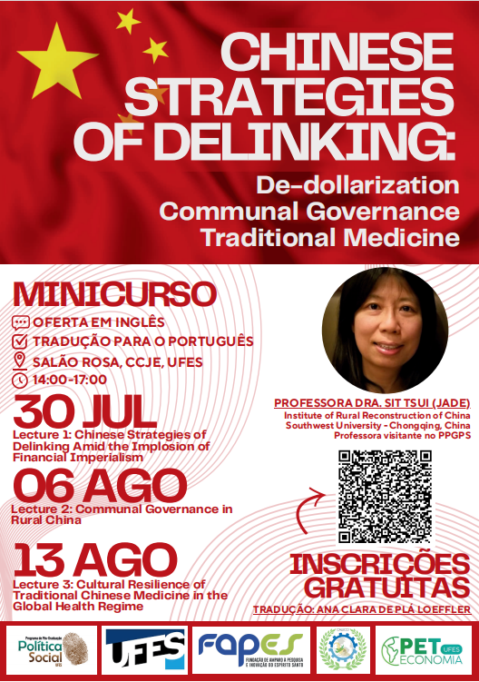 O minicurso será ministrado pela professora visitante do PPGPS Sit Tsui (Jade), do Instituto de Reconstrução Rural da China, da Southwest University (Chongqing, China). A proposta é discutir como o país adota estratégias de desvinculação em meio à implosão do imperialismo financeiro, particularmente à tendência de desdolarização, de fortalecimento da governança comunitária em áreas rurais, bem como de revitalização da Medicina Tradicional Chinesa (MTC).