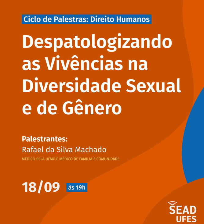 Nesta quarta-feira, 18 de setembro, a Superintendência de Educação a Distância (Sead) promoverá a palestra Despatologizando as vivências na diversidade sexual e de gênero, ministrada pelo médico de Família e Comunidade Rafael Machado. A transmissão acontecerá pelo canal da Sead no Youtube, a partir das 19 horas, e será aberta ao público em geral. Os interessados em obter certificado devem fazer inscrição prévia na Plataforma Colibri.