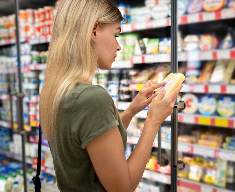 Imagem de uma mulher olhando o rótulo de um produto no supermercado