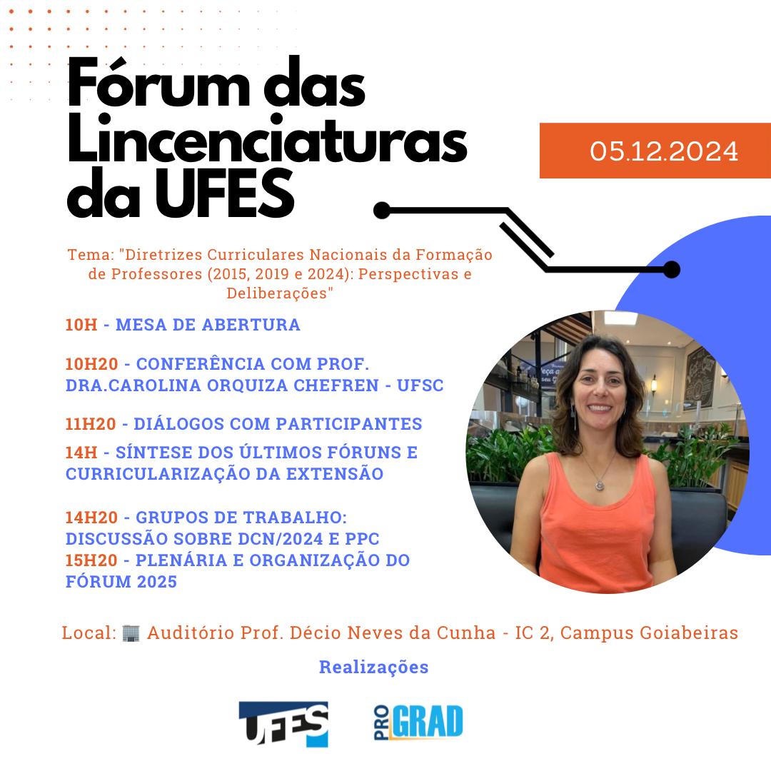 A Pró-Reitoria de Graduação (Prograd/Ufes) realiza nesta quinta-feira, 5, das 10 às 16 horas, o Fórum das Licenciaturas da Ufes. O evento será presencial e acontecerá no auditório do prédio IC-II (IC 2), no campus de Goiabeiras.