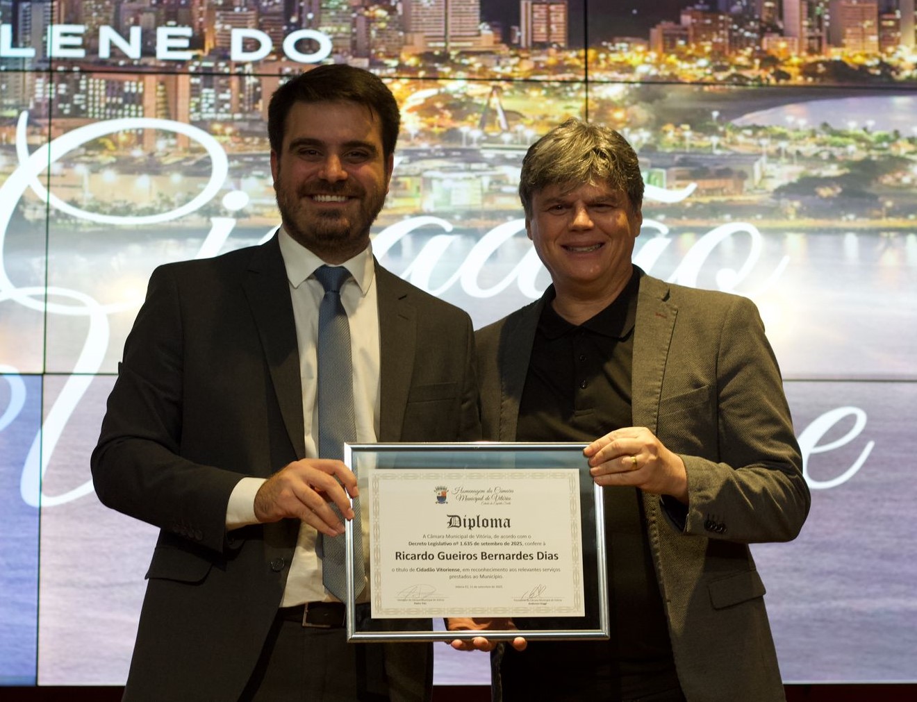 Para Gueiros, a homenagem funcionou como uma “segunda certidão de nascimento”, reforçando seu vínculo afetivo com Vitória. “Desde os primeiros momentos, fui cativado pelas belezas naturais e pela hospitalidade do povo. A honra que recebo agora, por serviços prestados à educação, é um testemunho da minha imersão na cultura capixaba, algo que a Ufes me permitiu vivenciar e aprofundar. Ser reconhecido desta forma não é apenas uma homenagem profissional, mas uma validação da minha história e do meu coração, que agora também pertencem a Vitória”, afirmou ele, que foi indicado pelo vereador Pedro Trés.