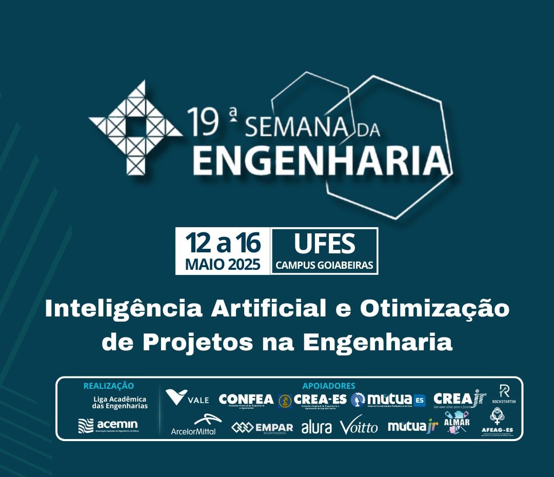 O campus Goiabeiras da Ufes vai sediar entre os dias 12 e 16 de maio a 19ª Semana da Engenharia (Seng), que terá como tema Inteligência Artificial e Otimização de Projetos na Engenharia. São esperados cerca de 500 estudantes de Engenharia em busca de expandir seus conhecimentos por meio de palestras, workshops, minicursos, visitas técnicas e outras atividades com a presença de profissionais de referência no mercado.